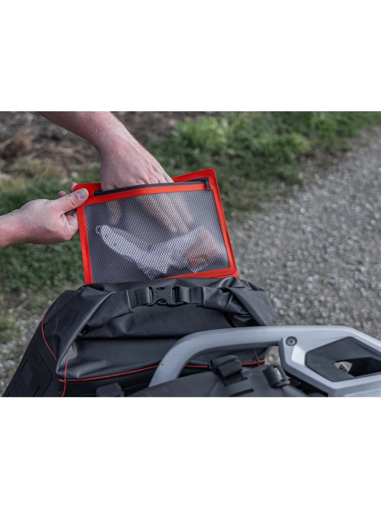 Dodatkowa klapa zabezpiecza zwinięte zamknięcie sakwy i zawiera punkt mocowania. Pod klapą znajdują się dwie elastyczne taśmy, przydatne do przewożenia rękawic lub lekkiej odzieży przeciwdeszczowej. Na jednej z sakw umieszczono również niewielką kieszeń na zamek, przeznaczoną na dokumenty lub drobne przedmioty.