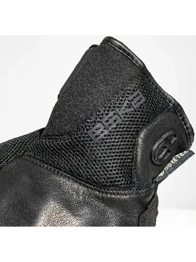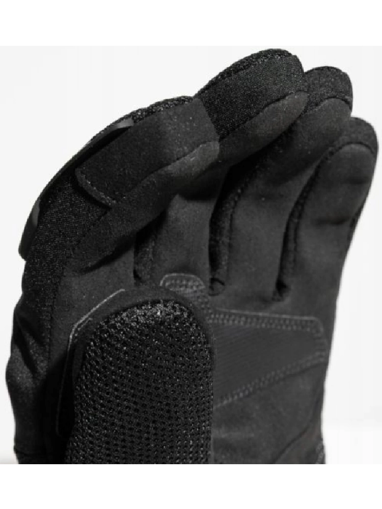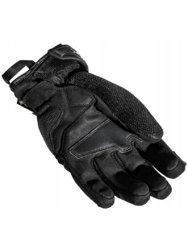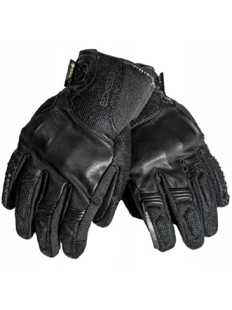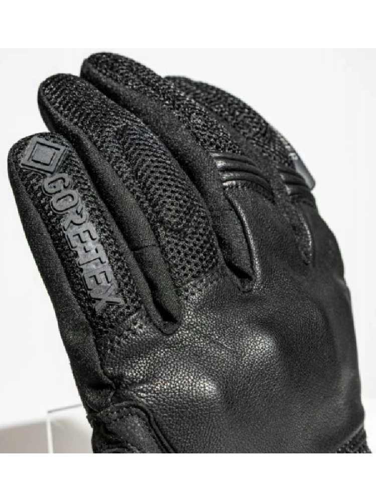 Zewnętrzna warstwa rękawic zawiera elementy z AX Suede i tkaniny Super GORE-TEX, co przekłada się na ich wodoodporność przy zachowaniu wysokiego poziomu oddychalności. W obszarach najbardziej narażonych na tarcie i nacisk znajdują się dodatkowe panele ochronne oraz amortyzujące, redukujące przenoszenie drgań z kierownicy. Rękawice zostały wyposażone w miękki protektor kostek oraz wstawkę z materiału do wycierania gogli. Palec wskazujący umożliwia obsługę ekranów dotykowych, co ułatwia korzystanie z nawigacji lub smartfona bez zdejmowania rękawicy. System zapinania z regulowanym paskiem pozwala na odpowiednie dopasowanie, a ergonomicznie uformowany krój sprzyja wygodzie podczas jazdy na dłuższych trasach.