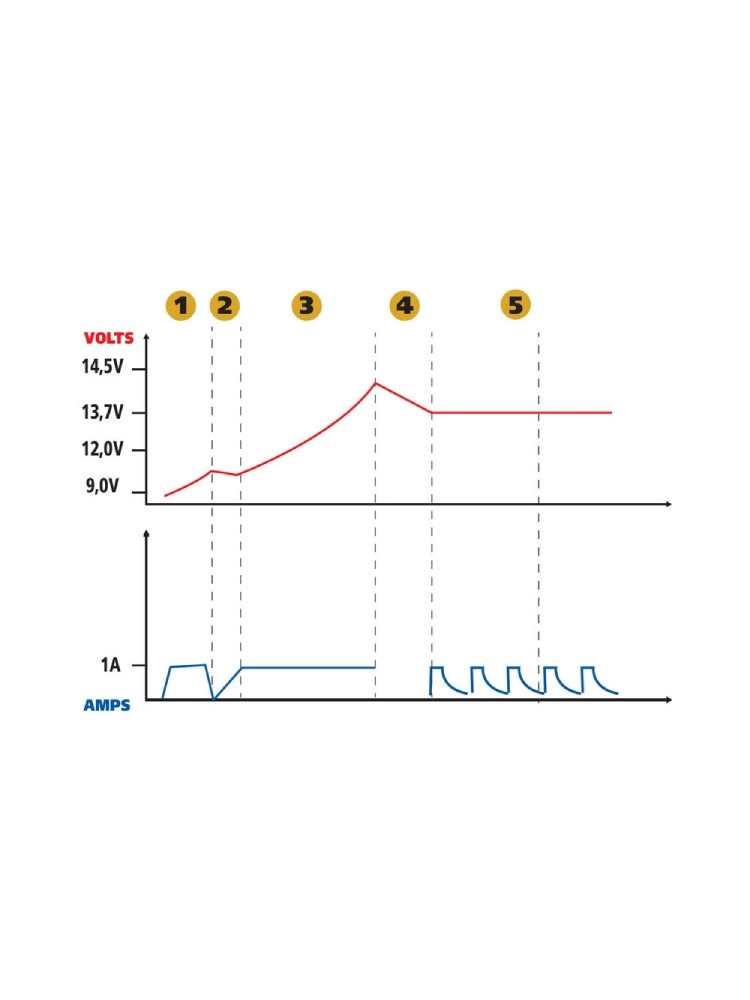 - Zaawansowany mikroprocesor z 4 trybami ładowania. Urządzenie samodzielnie dopasowuje tryb pracy do stanu akumulatora, co pozwala na efektywne ładowanie, konserwację oraz regenerację bez potrzeby ręcznej konfiguracji.