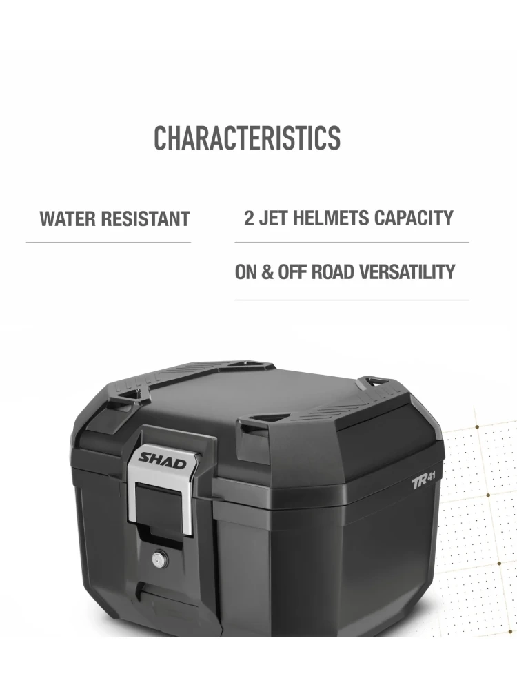 Dzięki pojemnej konstrukcji kufer pozwala na bezpieczny transport dwóch kasków motocyklowych otwartych, co czyni go idealnym rozwiązaniem zarówno na codzienne dojazdy, jak i długodystansowe wyprawy. Kufer centralny TR41 jest również wodoodporny (IPX5).