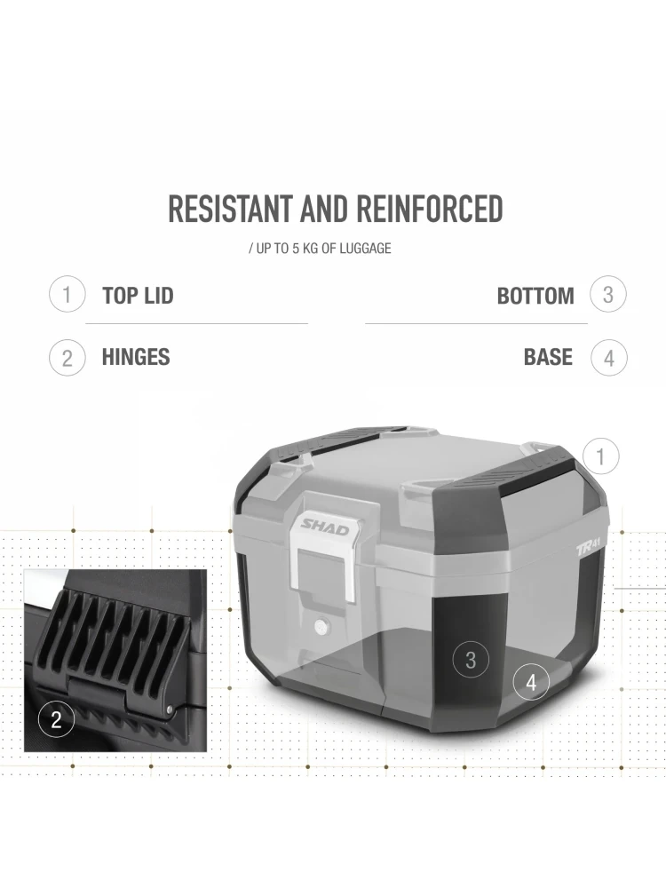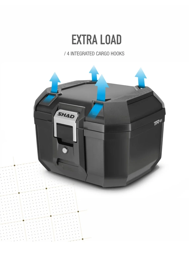 Model TR41 wyposażono również w cztery haki Cargo umieszczone na pokrywie, które umożliwiają przewożenie dodatkowego ładunku lub mocowanie bagażu elastycznymi pasami.