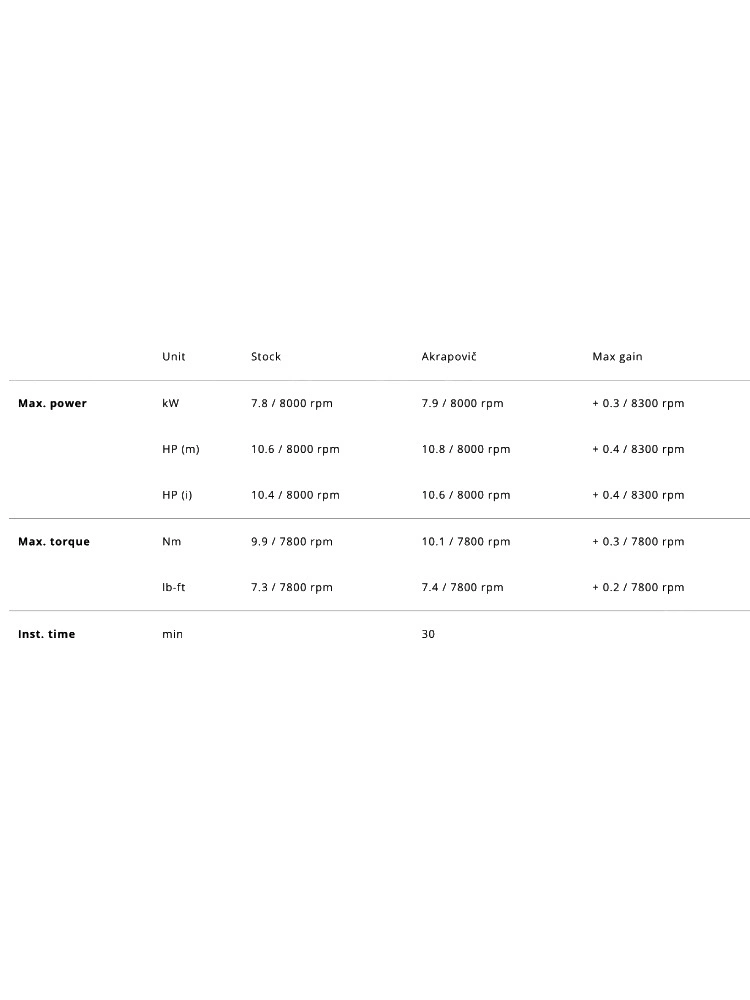 - Moment obrotowy: 10,1 Nm @ 7800 rpm (+ 0,3 Nm @ 7800 rpm)