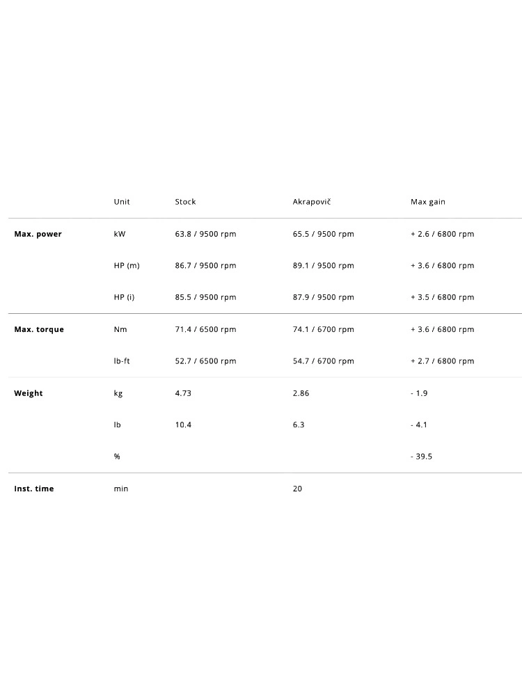 - Moment obrotowy: 74,1 Nm @ 6700 rpm (+ 3,6 Nm @ 6800 rpm)