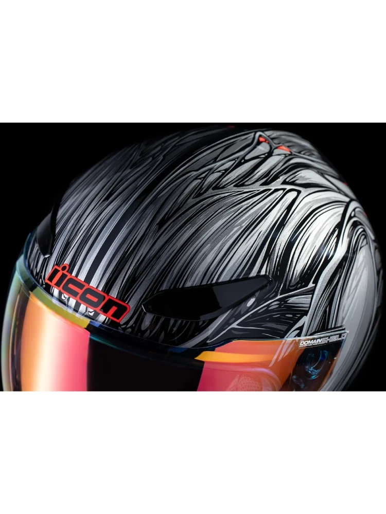 Icon Domain kask integralny, opracowany z myślą o motocyklistach lubiących rywalizację i wyścigi motocyklowe. Posiada zapięcie typu DD, które nie tylko oferuje najwyższy poziom bezpieczeństwa, ale również stanowi przepustkę na użytkowanie kasku po torach wyścigowych. Kompozyt FRP to materiał, z którego wykonano skorupę kasku, dzięki czemu jest wytrzymała i odporna na uderzenia. Kask integralny Domain można w legalny sposób użytkować w krajach należących do Unii Europejskiej, gdyż model ten posiada homologację ECE 22-06. Zastosowany spojler posiada właściwości aerodynamiczne, co przekłada się m.in. na stabilną pozycję kasku na głowie użytkownika, a także redukcję oporu przy wysokich prędkościach. Wewnątrz znajduje się trójwarstwowa wyściółka HydraDry z właściwościami hipoalergicznymi i antybakteryjnymi, którą można wyjąć i wyprać. Takie rozwiązanie sprawia, że dbanie o higienę jest niezwykle proste i przyjemne. We wspomnianej wyściółce wycięto specjalne otwory, aby umożliwić montaż opcjonalnego interkomu motocyklowego (brak w zestawie). Optymalną cyrkulację powietrza zapewnia system wentylacji, składający się z kanałów wlotowych i wylotowych. Dobrą widoczność w różnych warunkach pogodowych zapewnia wizjer, który wyposażono w przeciwmgielną powłokę (Anti-Fog).