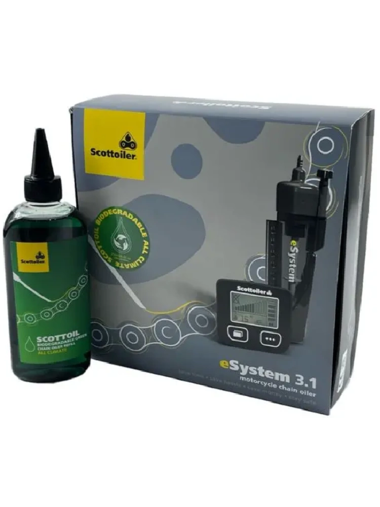 Scottoiler E-System to nowoczesna, automatyczna olejarka łańcucha, zaprojektowana z myślą o maksymalnej wygodzie i trwałości układu napędowego. Dzięki elektronicznemu wyświetlaczowi w wersji 3.1 oferuje pełną kontrolę nad smarowaniem – użytkownik może monitorować temperaturę otoczenia, tempo kapania oraz poziom oleju w zbiorniku, a także zaprogramować system przy użyciu dodatkowego zbiornika. Zaawansowana technologia zaczerpnięta z MotoGP, w tym trójosiowy akcelerometr, rejestruje ruch motocykla i aktywuje olejarkę tylko podczas jazdy, co gwarantuje maksymalną wydajność i minimalne zużycie energii. Urządzenie pobiera mniej niż 200 mA w stanie spoczynku, dzięki czemu nie obciąża akumulatora. Zbiornik REP o pojemności 60 ml wystarcza nawet na 1530 km, a precyzyjne dozowanie zapewnia idealne smarowanie bez strat. E-System działa niezależnie od temperatury (0–40°C), można go regulować jednym przyciskiem, także w trakcie jazdy. Kompatybilny z akcesoriami Scottoiler, pasuje do wszystkich typów motocykli, również z wtryskiem paliwa. Przedłuża żywotność łańcucha nawet siedmiokrotnie, zwiększając efektywność układu napędowego do 2 kW.