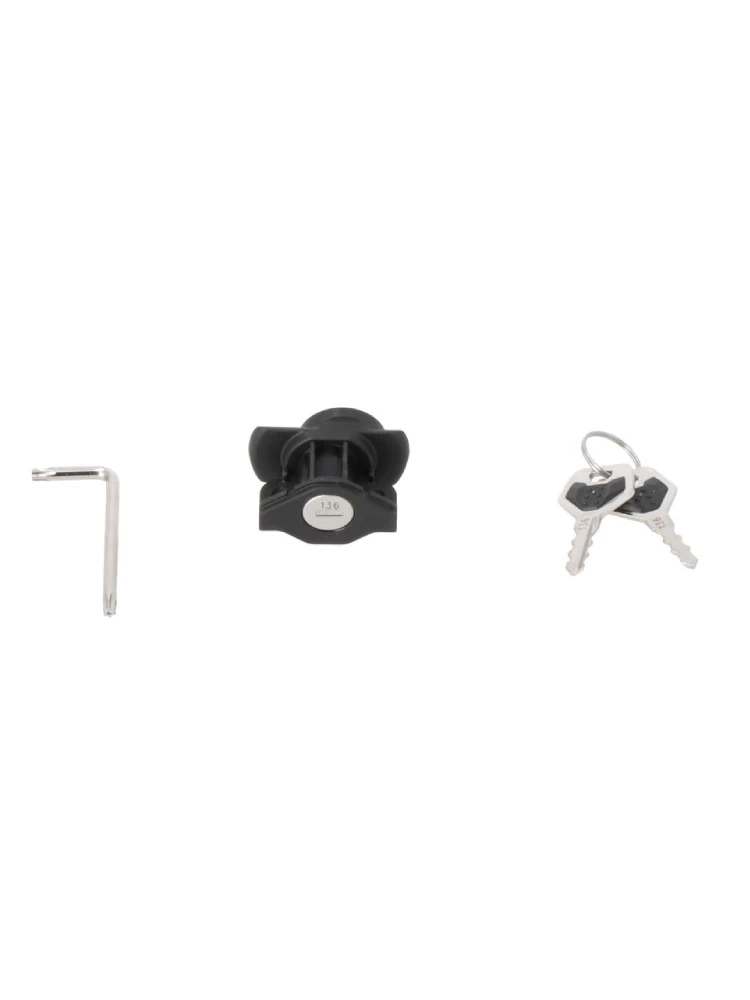 - Zamek zabezpiecza pokrywę kufra przed otwarciem oraz blokuje kufer na stelażu