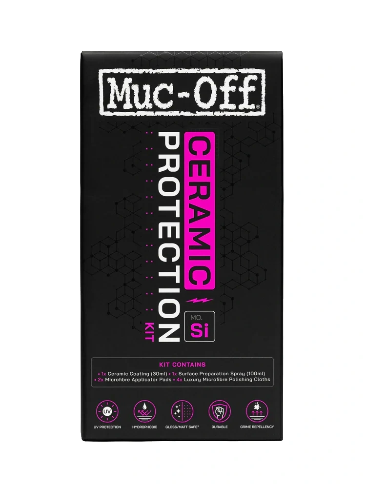 Muc-Off Ceramic Protection Kit to profesjonalny zestaw do zabezpieczania powierzchni, stworzony z myślą o osobach, które oczekują maksymalnej ochrony i perfekcyjnego wyglądu swojego motocykla. Zaawansowana powłoka ceramiczna tworzy trwałą, silikonową barierę, która wiąże się z lakierem, zapewniając wyjątkową odporność na zabrudzenia, wodę i czynniki zewnętrzne. Dzięki silnym właściwościom hydrofobowym woda i brud nie osiadają na powierzchni, a ich usuwanie staje się szybkie i bezproblemowe.
