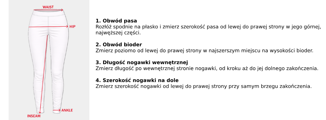 | Rozmiar | Pas [cm] | Biodra [cm] | Długość wewnętrzna nogawki [cm] | Kostka [cm] |