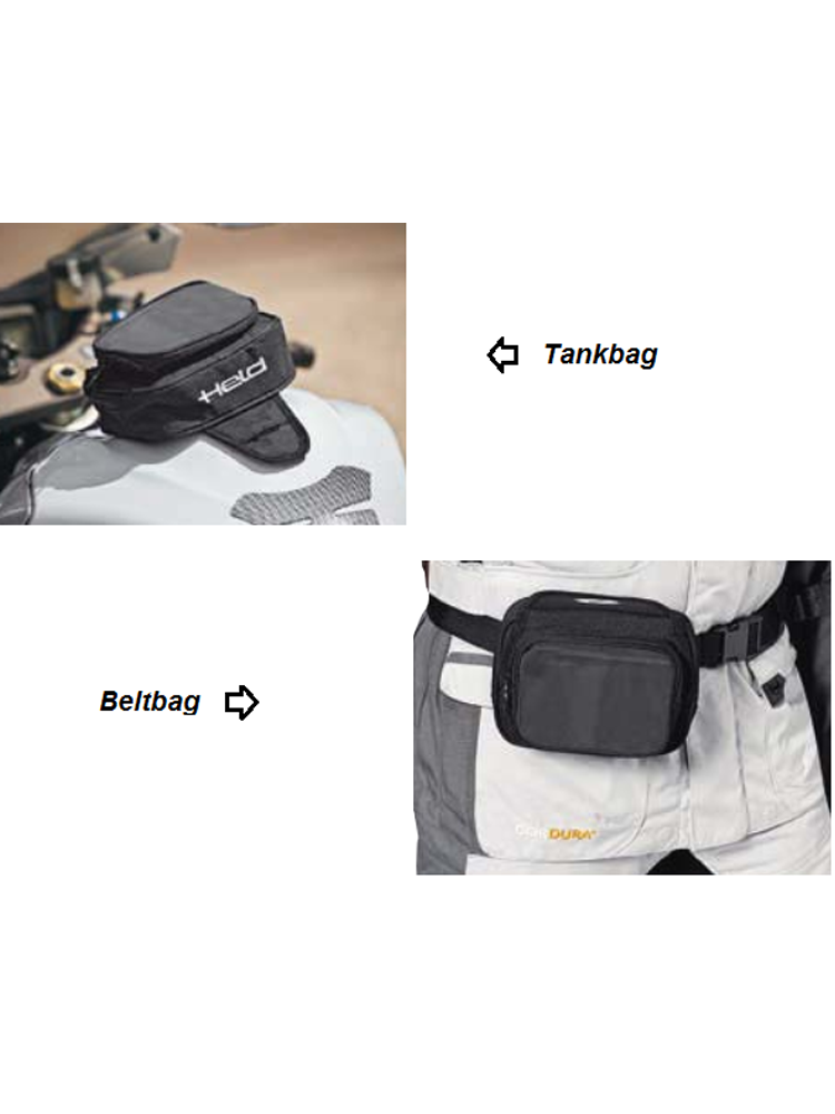 TINY to torba niemieckiej firmy HELD będąca produktem 2 w 1 - tankbagiem i torbą na biodra. Wykonana z wodoodpornej tkaniny PVC (100% poliester). Mocowana za pomocą systemu magnesów. Pojemna pomimo niepozornych rozmiarów. Idealna w długie trasy.