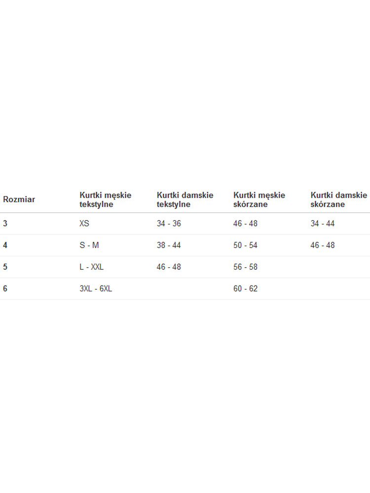 Tabela doboru protektora do kurtki: