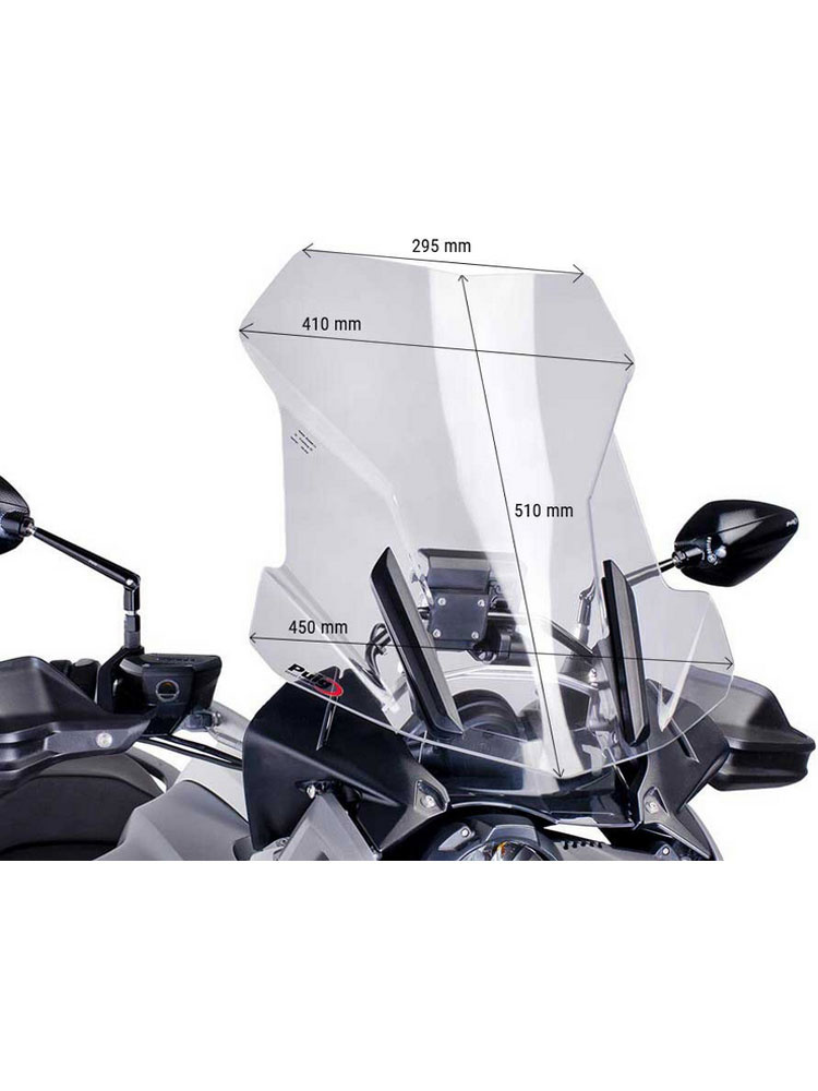 Turystyczna szyba PUIG. Dodatkowe przedłużenie w górnej części zapewnia doskonałą ochronę przed wiatrem nawet przy długich podróżach. Zaprojektowana w wirtualnym tunelu aerodynamicznym. Wysoka jakość optyczna (akryl 3 mm). Mocowana w miejsce fabrycznej, za pomocą fabrycznych śrub.Posiada niemiecki atest TUV.