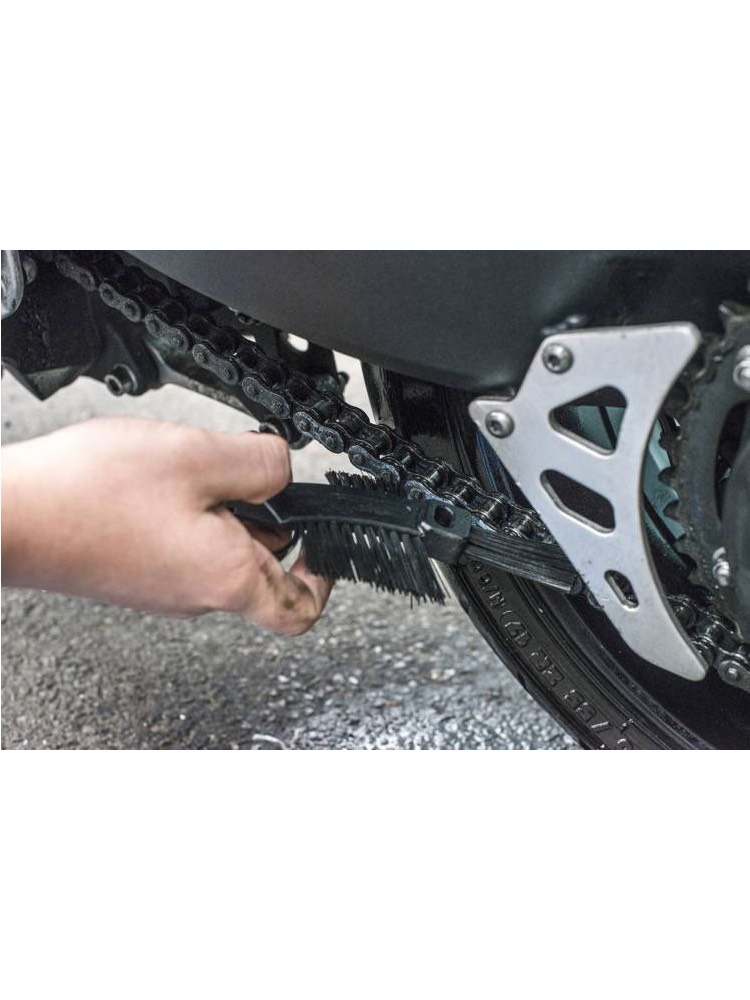 Szczotka do czyszczenia łańcucha i trudno dostępnych miejsc, wyposażona w trzy główki różnej wielkości dla skuteczniejszego czyszczenia zakamarków. Profilowane zakończenie uchwytu pozwala usuwać zaschnięty brud, a także skutecznie czyścić zębatki. Łatwa do zawieszenia, z wytrzymałym nylonowym włosiem.