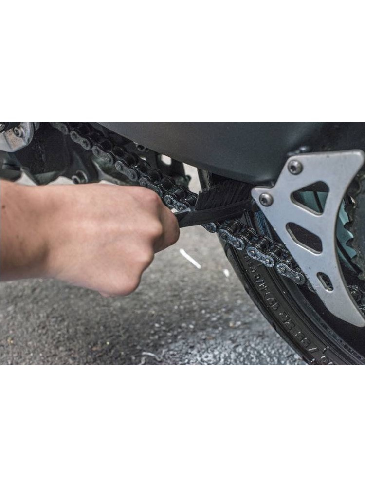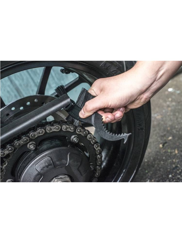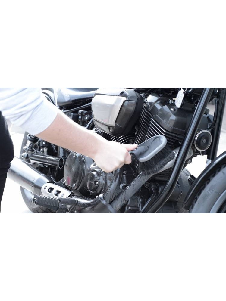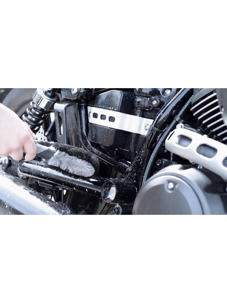 Dwuramienna szczotka do czyszczenia trudno dostępnych miejsc, takich jak tarcze hamulcowe, szprychy, zawieszenie i podnóżki. Łatwa w przechowywaniu dzięki otworowi do zawieszenia. Gumowane elementy chronią zarówno szczotkę, jak i delikatne części motocykla. Włosie nylonowe jest wyjątkowo wytrzymałe.