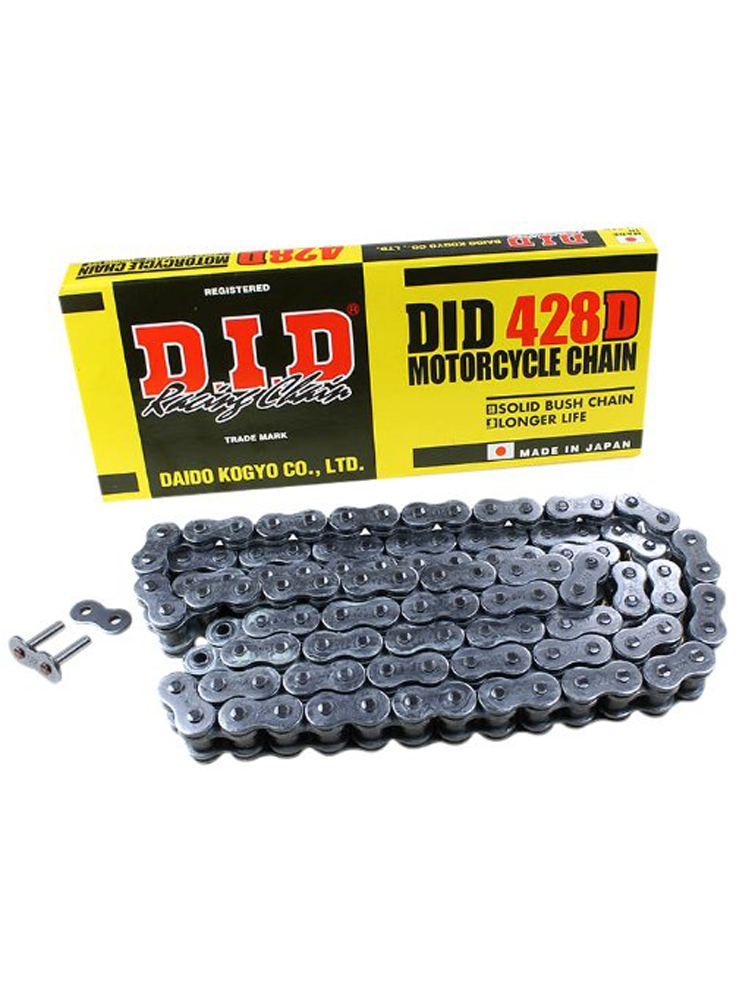 D.I.D 428D to nowy ulepszony łańcuch zastępujący DID428. Zastosowanie tulejki łańcucha bez szwu sprawiła iż odporność łańcucha na zużycie eksploatacyjne wzrosła z 20% do 50%.