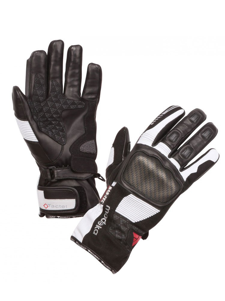Miłośniczkom turystyki motocyklowej Modeka oferuje wodoodporne i wygodne rękawice Tacoma. Ten damski model rękawic motocyklowych wyposażony jest w membranę Porelle®, która cechuje się wodo i wiatroodpornością, a także zapewnia bardzo dobrą oddychalność. Wykonane są z wytrzymałego, a zarazem wygodnego materiału Tactel (wierzch) oraz odpornej na ścieranie skóry bydlęcej (spód). Część chwytna oraz brzeg rękawicy wzmocniony został syntetyczną skórą Amara. Chroni to rękawice przed zbyt szybkim zużyciem jak również zapewnia doskonałą przyczepność. Oprócz mocnych materiałów Tacoma posiada wygodne, ale skuteczne ochraniacze kostek 3D SAS-TEC®, wzmocnienia na palcach TPU (środkowy i serdeczny) oraz na kciuku z materiału Schoeller®Keprotec® odpornego na przetarcia. Ponadto na części chwytnej zastosowano podwójne szwy. Elastyczne wstawki między palcami, na kciuku i grzbiecie zwiększają mobilność dłoni. Rękawice Tacoma mają długi mankiet z bezpiecznym zapięciem na rzep oraz regulacją w nadgarstku. Wycieraczka na palcu wskazującym zwiększa funkcjonalność rękawic.
