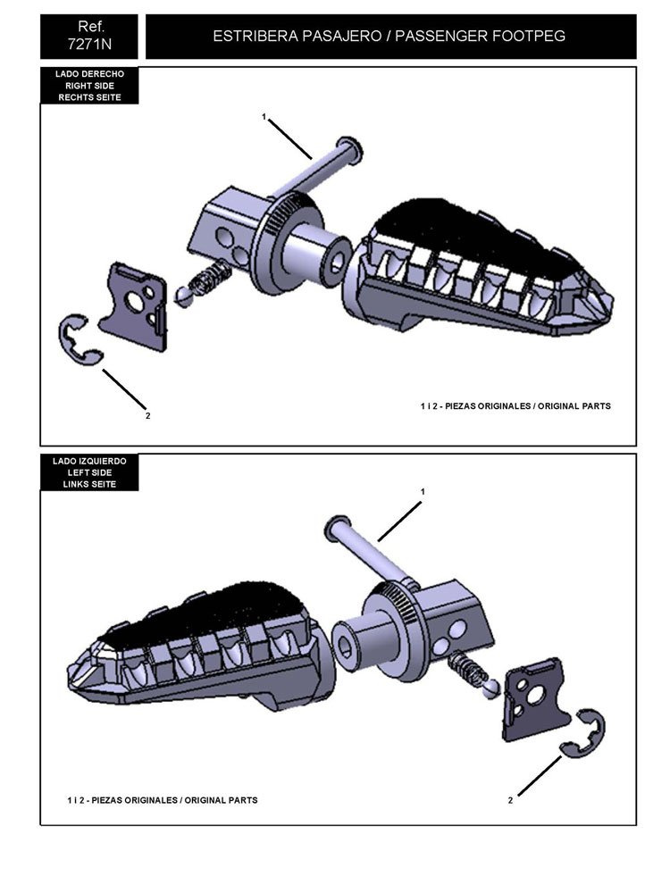 W komplecie para (na lewą i prawą stronę kierowcy lub pasażera) mocowań do podnóżków – same podnóżki należy dokupić osobno. Umożliwia zamocowanie podnóżków PUIG w danym motocyklu. Wersję podnóżków (kolor) należy dobrać indywidualnie.