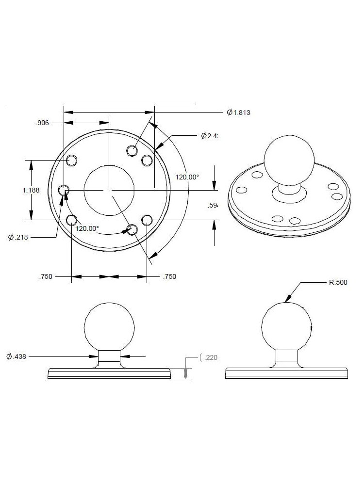 - głowica obrotowa (RAM-B-202U) składa się z gumowej kuli o średnicy 2.54 cm podłączonej z płaską podstawą o średnicy 6.35 cm