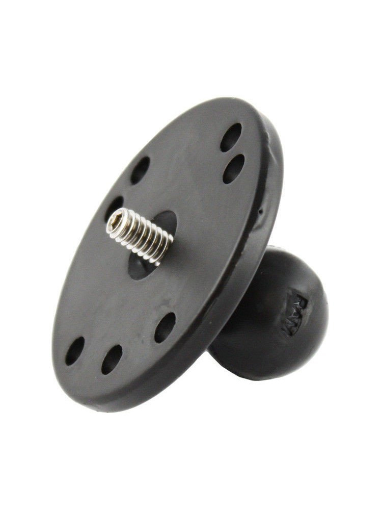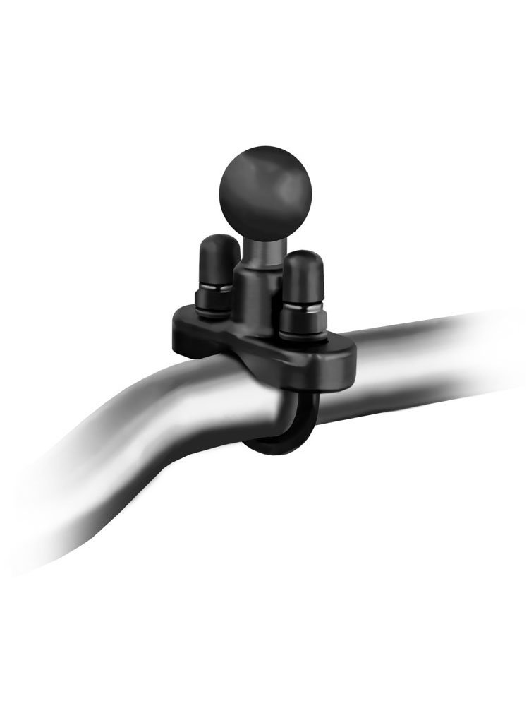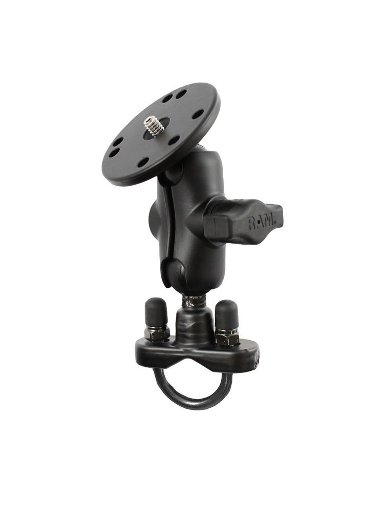 Uchwyt montowany do ramy kierownicy. Jest zintegrowany z ramieniem o długości 6.04 cm oraz z RAM-B-202AU - gumową kulą o średnicy 2.54 cm podłączoną z płaską, okrągłą podstawą o średnicy 6.35 cm zintegrowaną z 0.63 cm gwintem do montażu kamery lub aparatu. Gwint pasuje do większości standardowych aparatów i kamer. Okrągła podstawa dodatkowo zapewnia stabilność zamontowanego urządzenia.