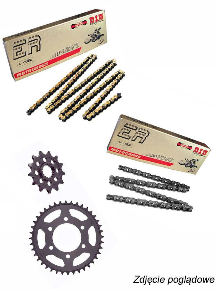 W skład zestawu wchodzi łańcuch napędowy DID428 NZ Super NON-O-RING Cross super wzmocniony, bezoringowy 132 ogniwa oraz zębatki: napędowa SUNF241-14 i napędzana SUNR1-2221-48.Są to części najwyższej jakości gwarantujące długą żywotność i przebieg nawet przy największych obciążeniach zestawu napędowego. Jeżeli motocykl fabrycznie był wyposażony w łańcuch zanitowany to nowych łańcuch musi być zamontowany wraz z ogniwem nitowanym.